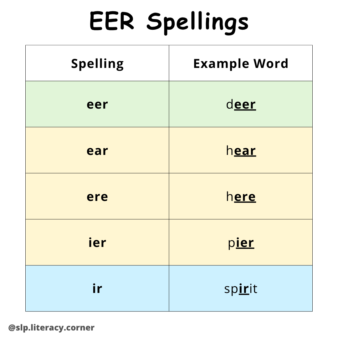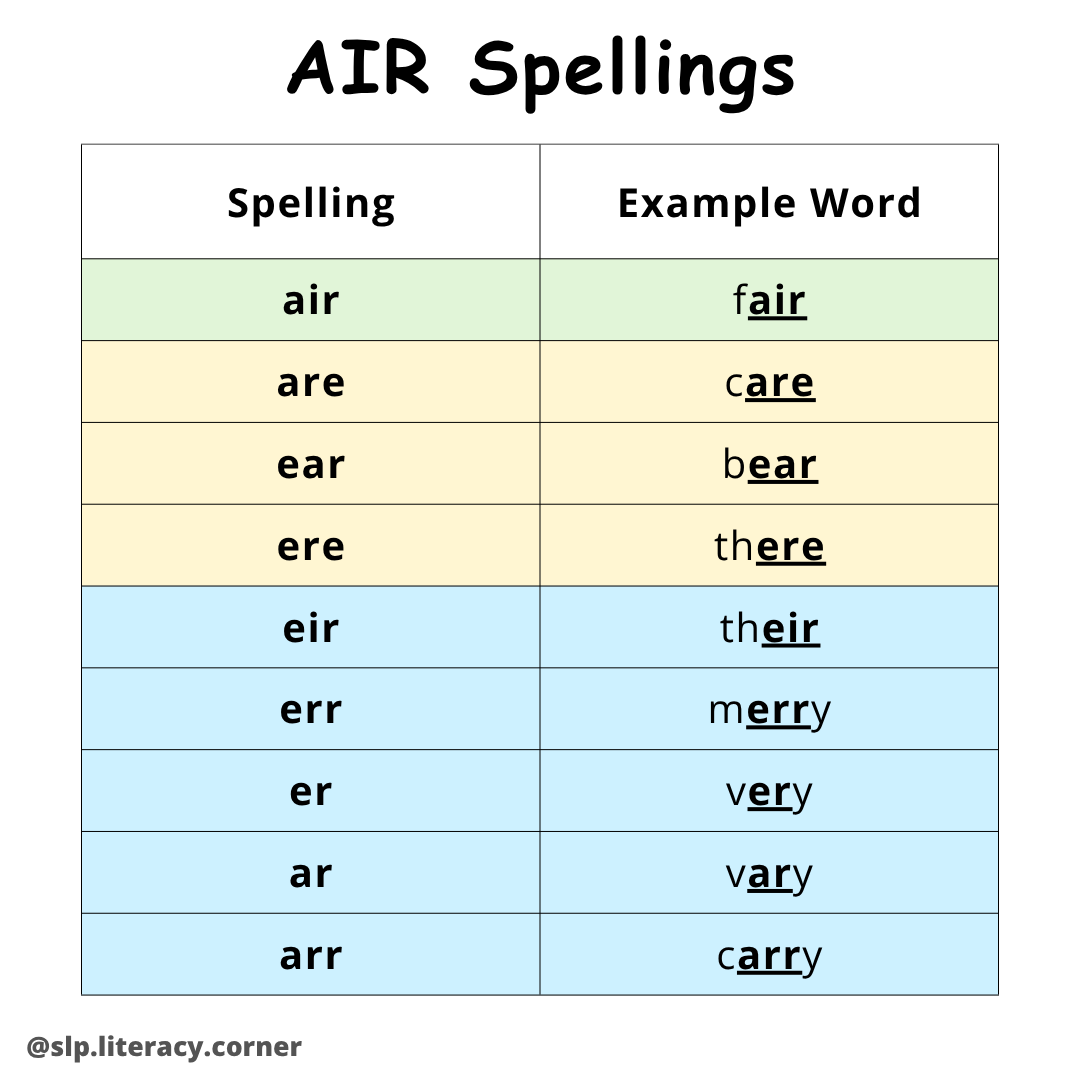 Please note that the sounds “air”, “eer”, and “ire” are each made up of two sounds (“air” = “ai” + “er,” “eer” = “ee” + “er,” “ire” = “i” + “er”). Additionally, pronunciation can vary depending on a speaker’s accent or dialect, which causes variation in how sounds and words are pronounced.